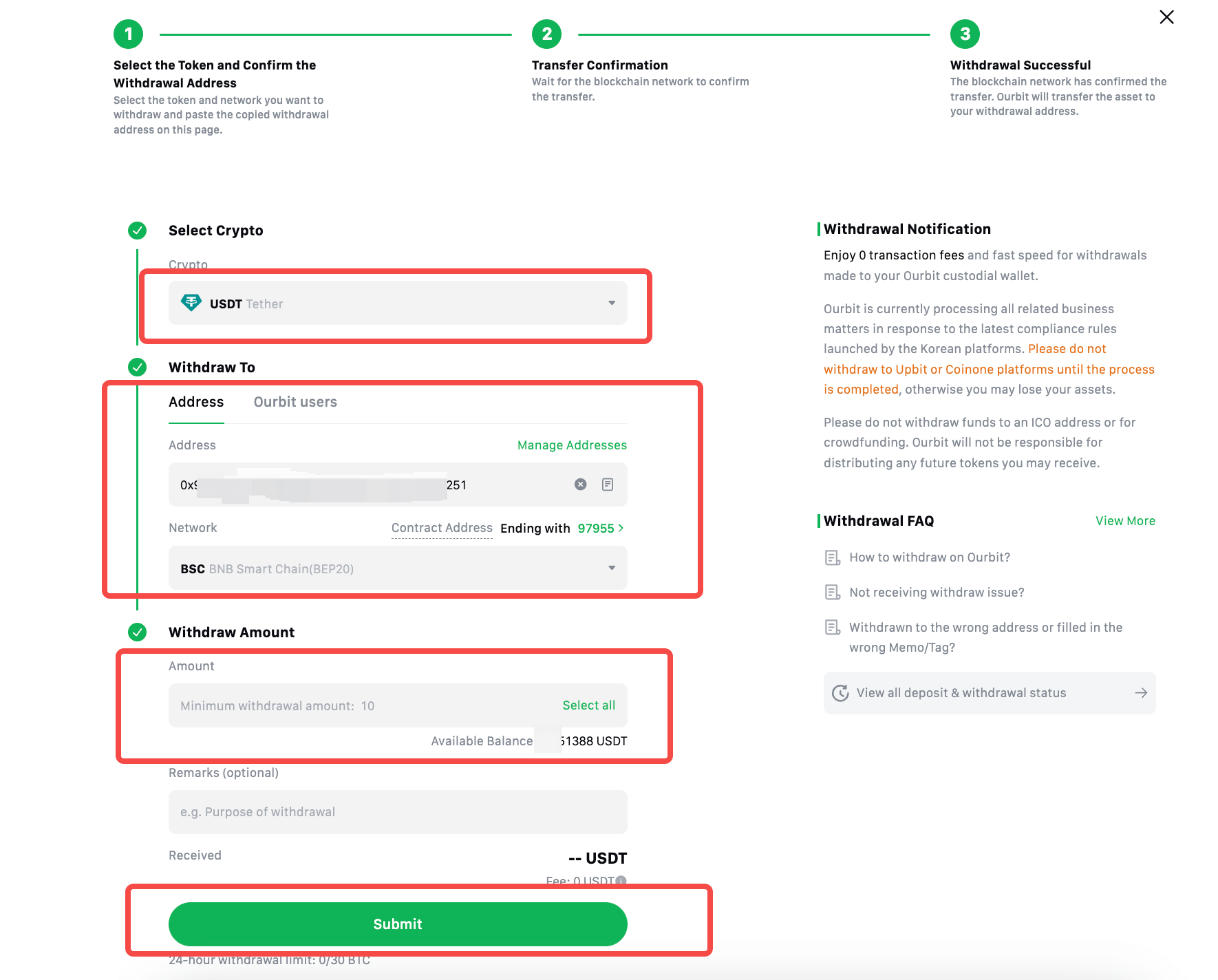 Шаг 2: Выберите токен для перевода, введите адрес получателя (аккаунт или кошелек Ourbit), выберите подходящую сеть перевода и укажите сумму. После проверки правильности всей информации нажмите [Отправить]