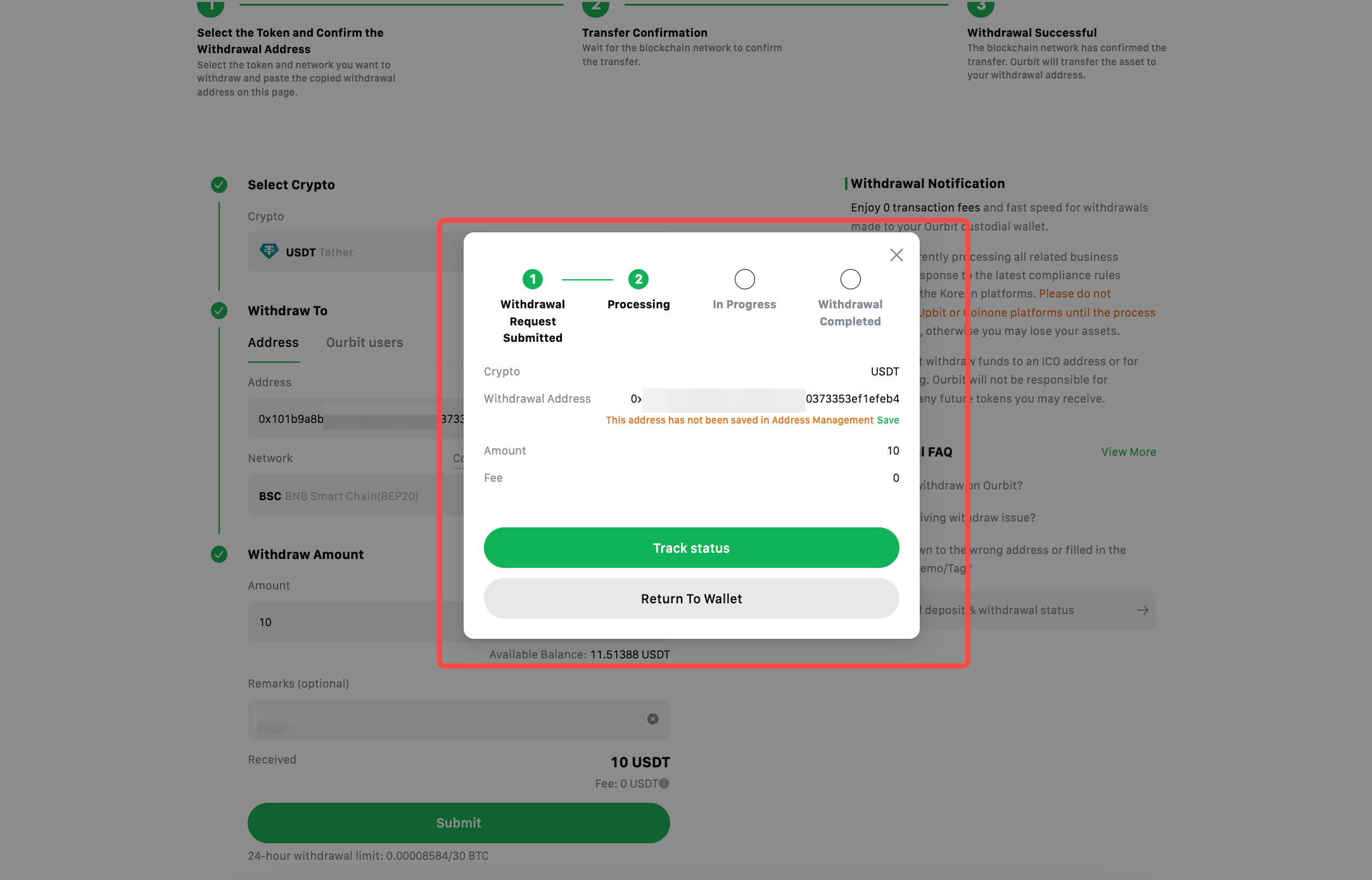 Шаг 4: Дождитесь завершения вывода средств. Нажмите на страницу, чтобы отслеживать статус вывода и просмотреть детали транзакции — после успешного вывода вы сможете получить хэш транзакции (Txid).