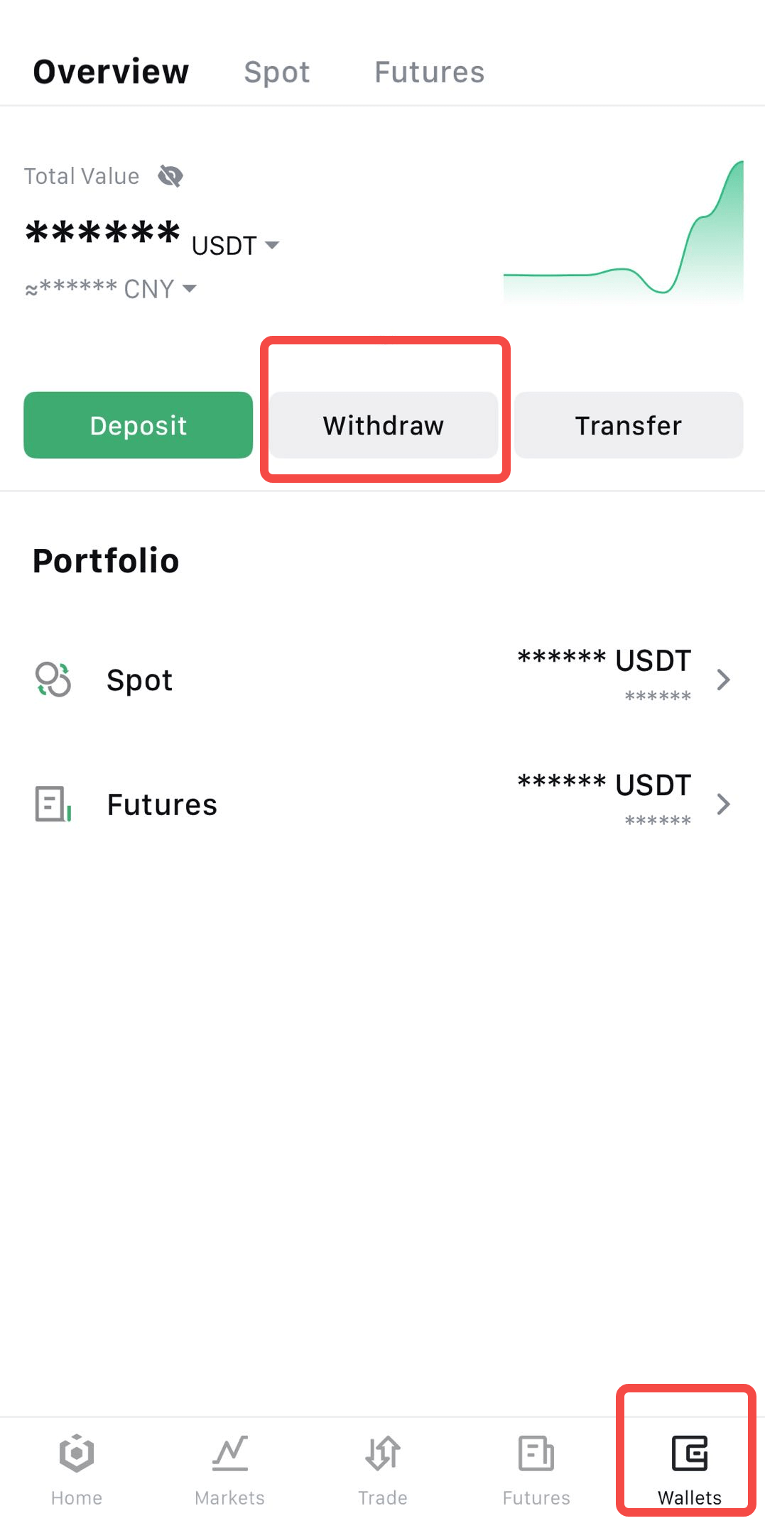 1.Откройте приложение Ourbit, затем нажмите [Кошельки] - [Вывод].