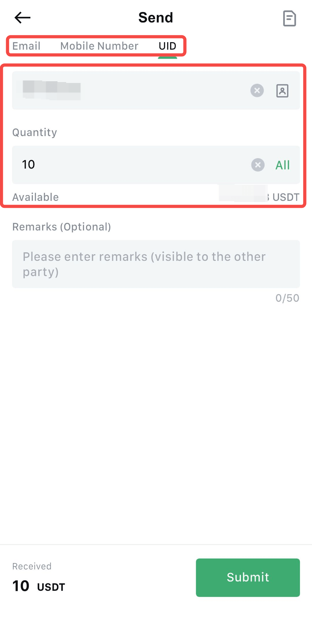 3.Выберите [Перевод Ourbit]. В настоящее время поддерживаются три метода перевода: [Электронная почта], [Номер телефона] и [Ourbit UID]. Заполните информацию о получателе соответственно.