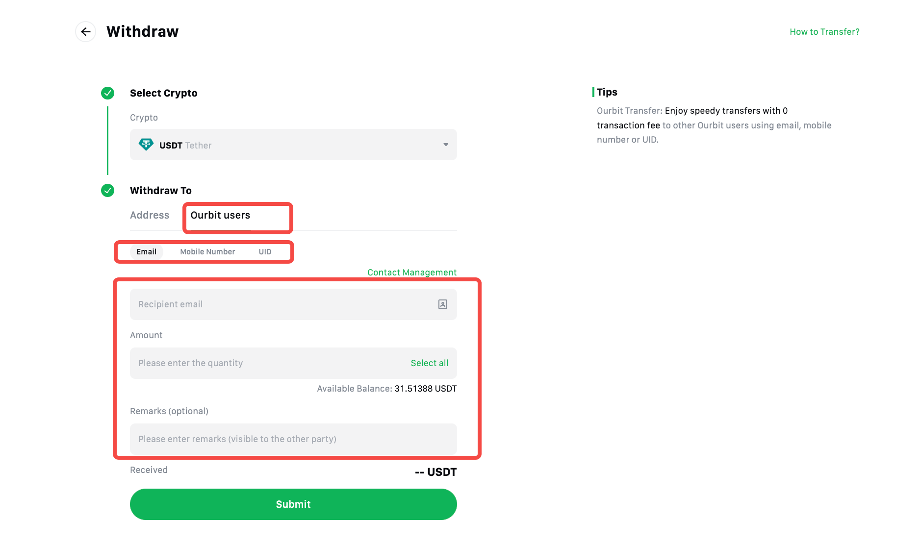 Adım 3: [Ourbit Kullanıcıları] seçeneğini seçin. Şu anda üç transfer yöntemi desteklenmektedir: [E-posta], [Telefon Numarası] ve [Ourbit UID]. Alıcının hesap bilgilerini buna göre doldurun.
