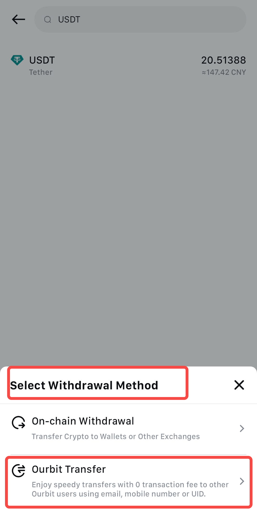 3.[Ourbit Transferi] seçeneğini seçin. Şu anda üç transfer yöntemi desteklenmektedir: [E-posta], [Telefon Numarası] ve [Ourbit UID]. Alıcının hesap bilgilerini buna göre doldurun.