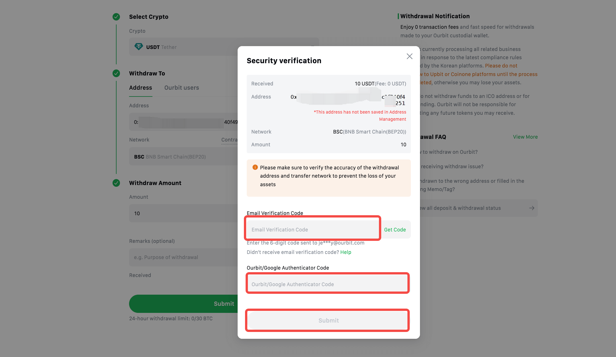 6.Lấy mã xác minh qua email và nhập vào, sau đó nhập mã Google Authenticator, rồi nhấn [Submit].