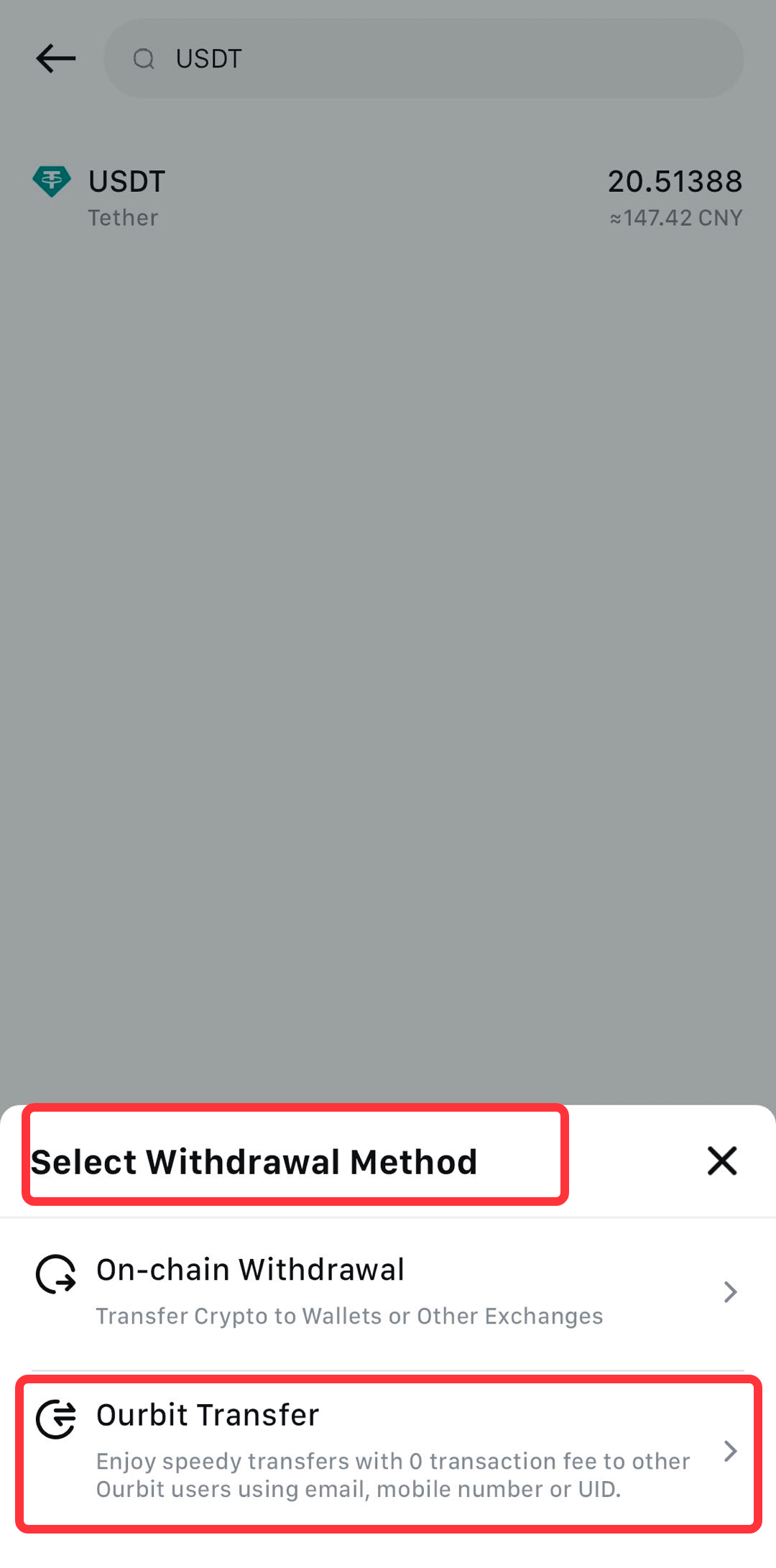 3.Chọn [Ourbit Transfer]. Hiện tại có ba phương thức chuyển được hỗ trợ: [Email], [Số điện thoại] và [Ourbit UID]. Nhập thông tin tài khoản của người nhận tương ứng.