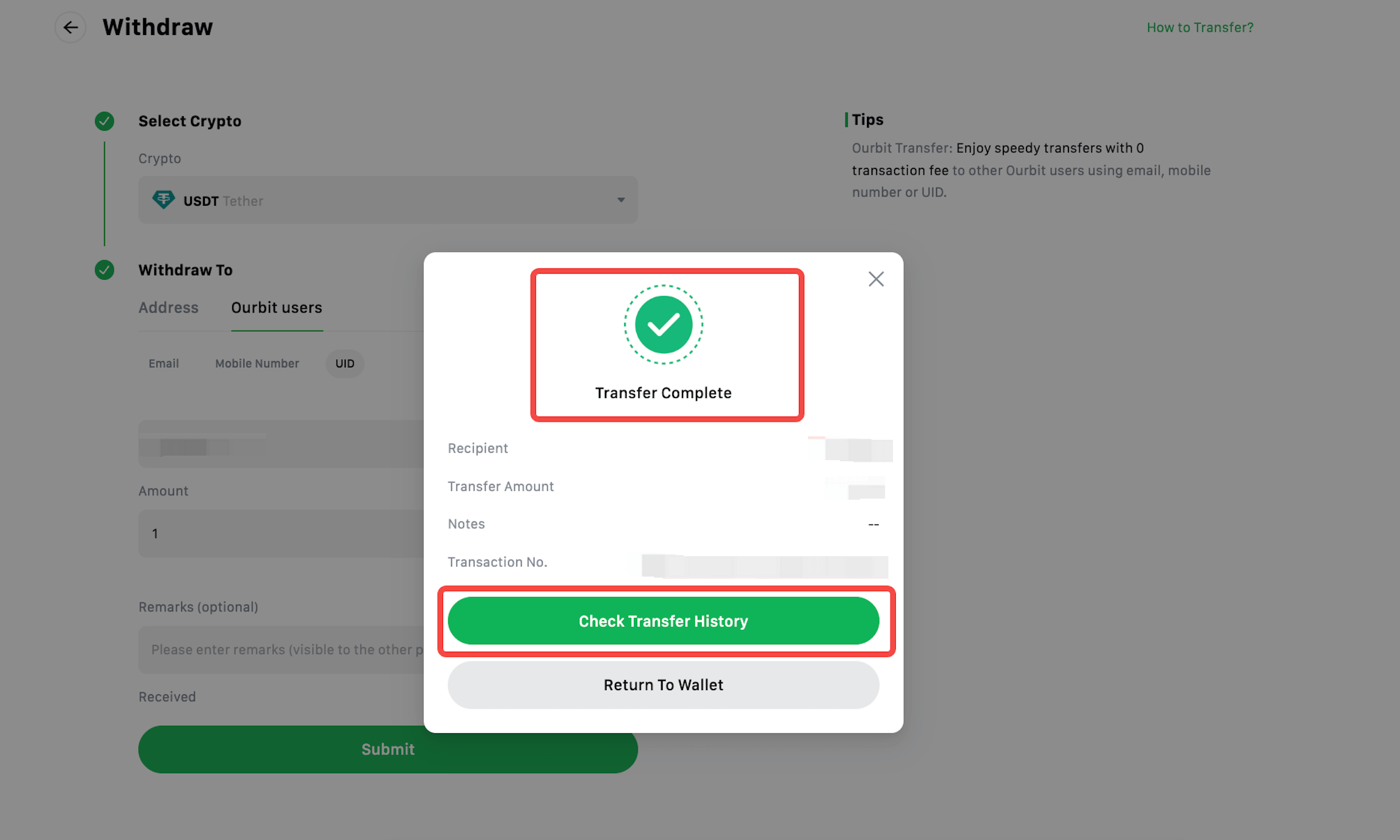 Với tính năng [Internal Transfer], bạn có thể dễ dàng gửi tài sản giữa các người dùng Ourbit mà không mất phí.