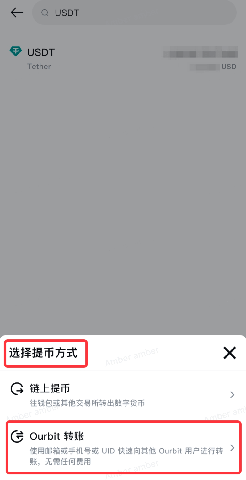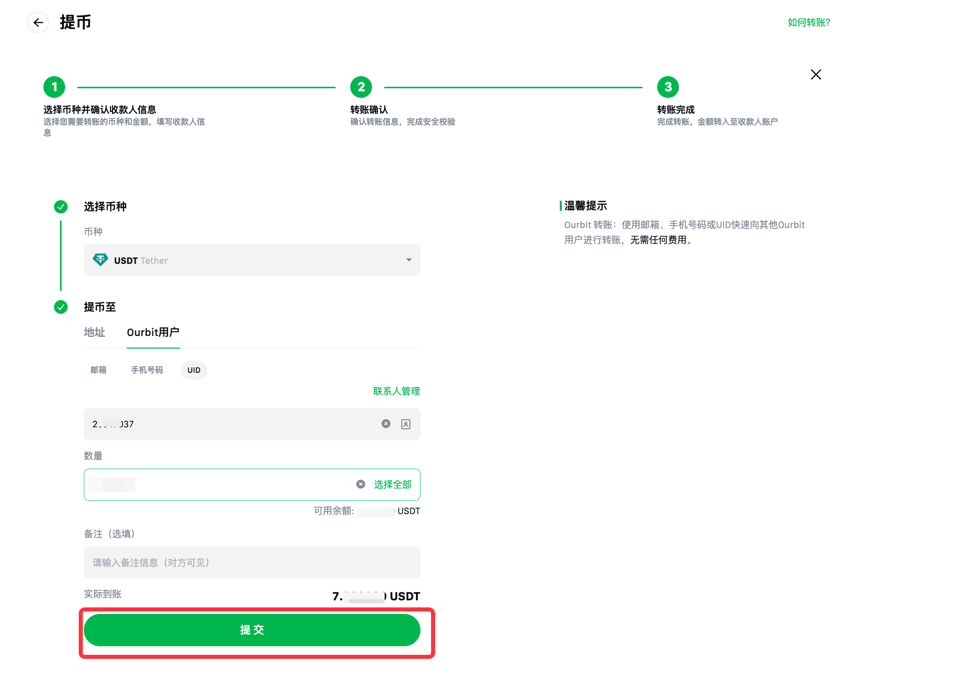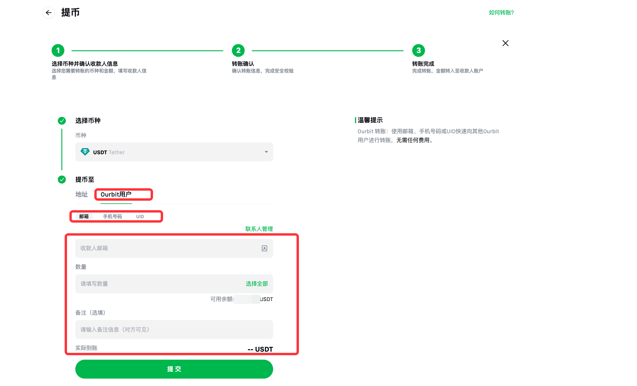 3.提币方式选择【Ourbit转账】,目前支持【邮箱】、【手机号码】、【Ourbit UID】三种转账方式,填写接收转账的账户信息。