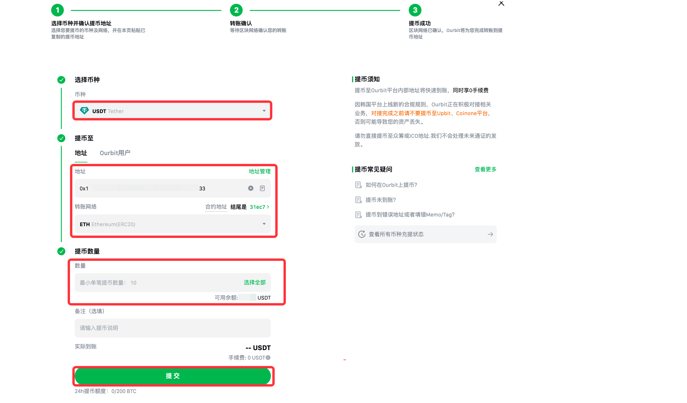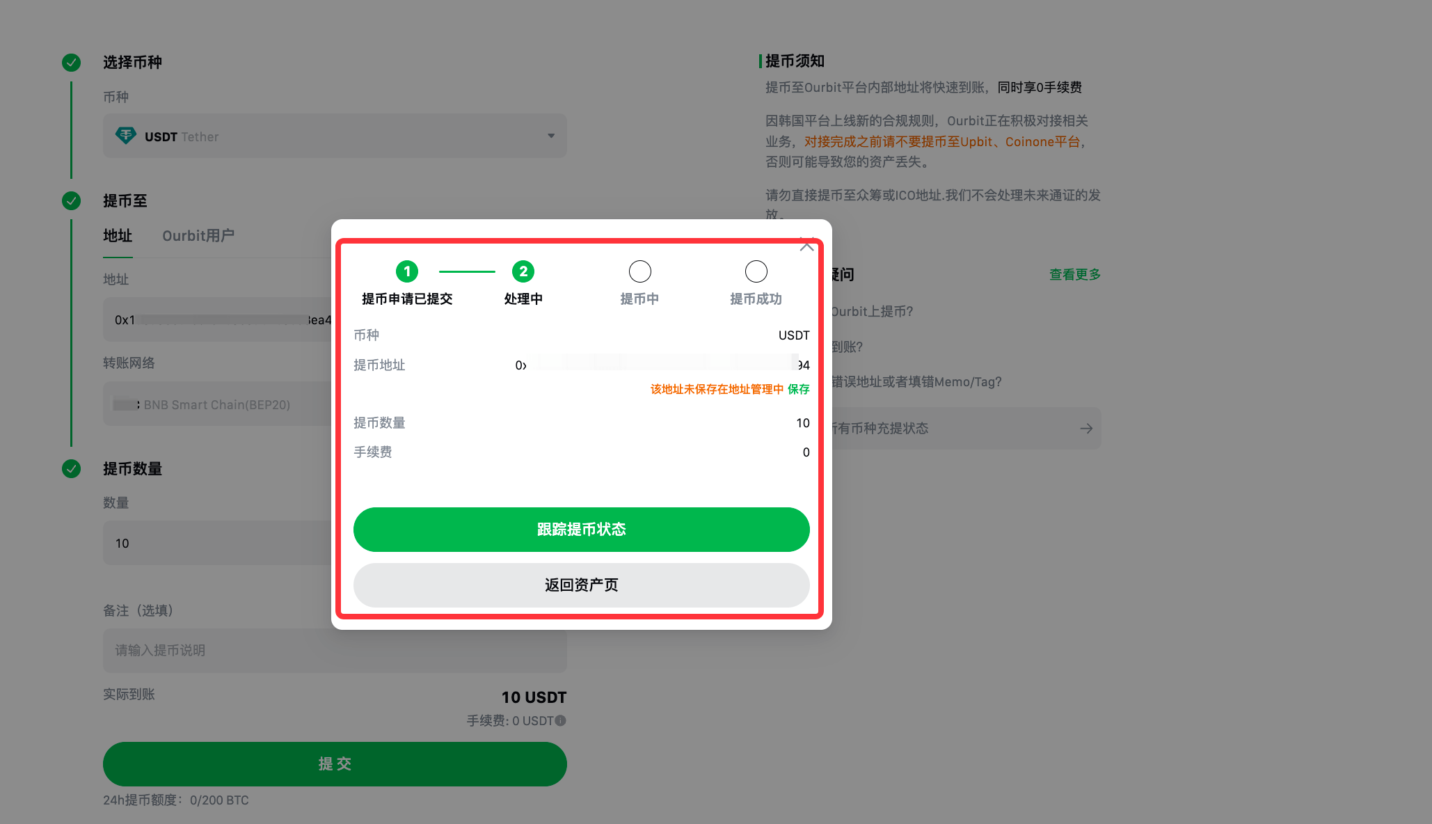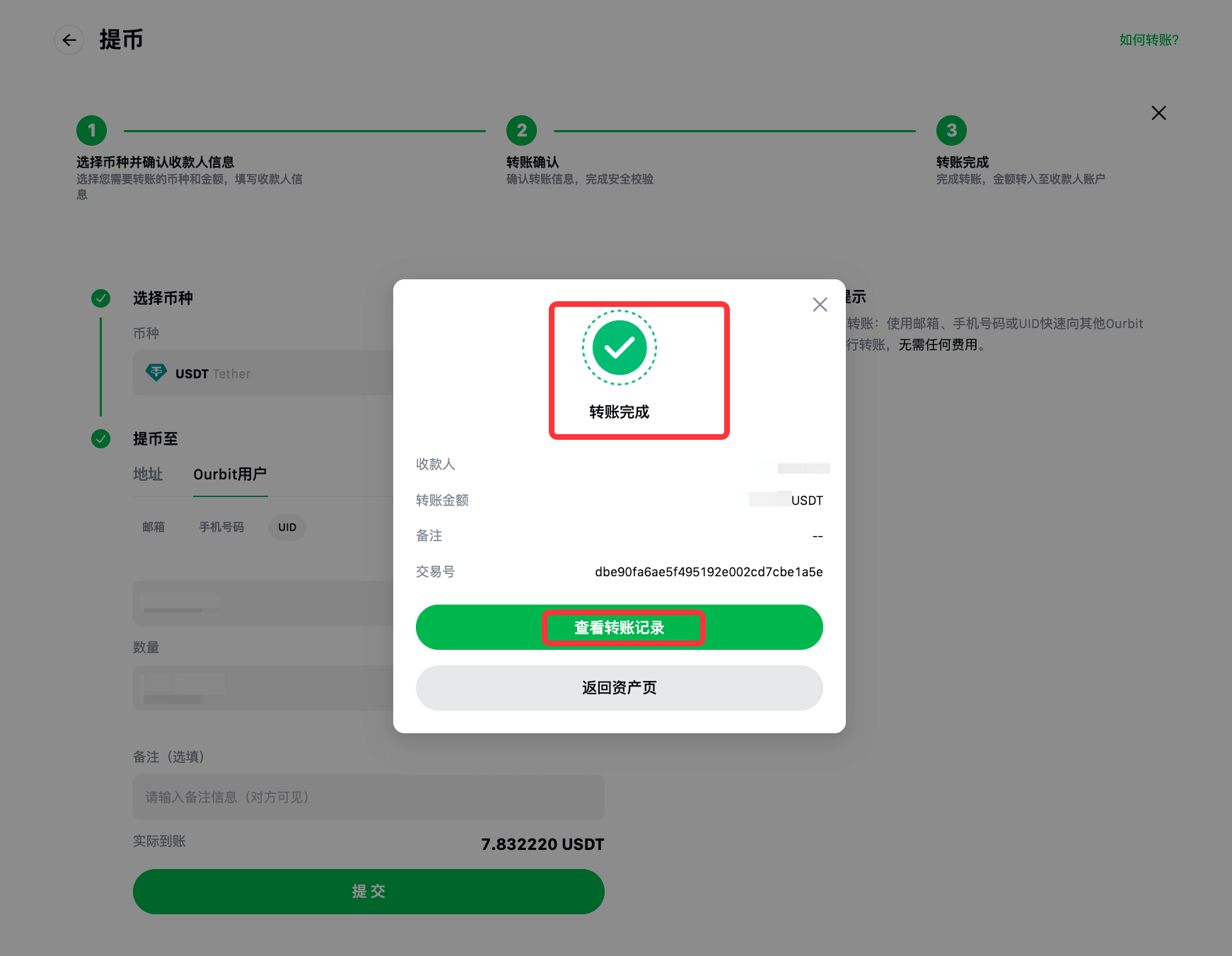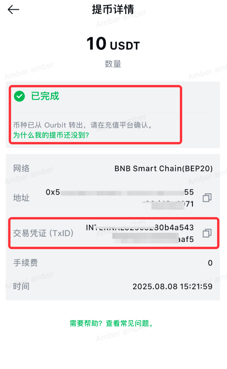 - 完成后可在提币详情页面获取交易凭证(TxID)