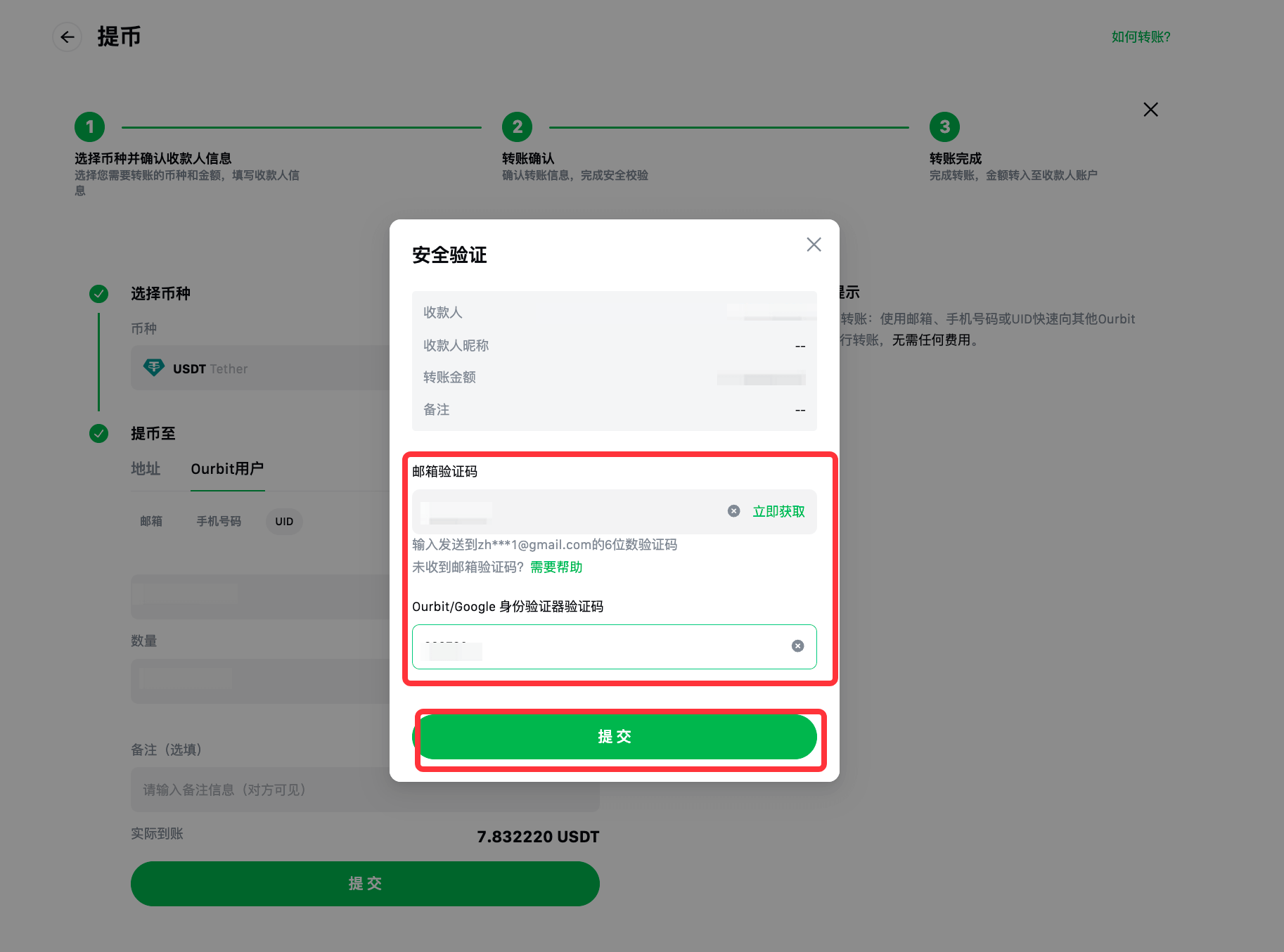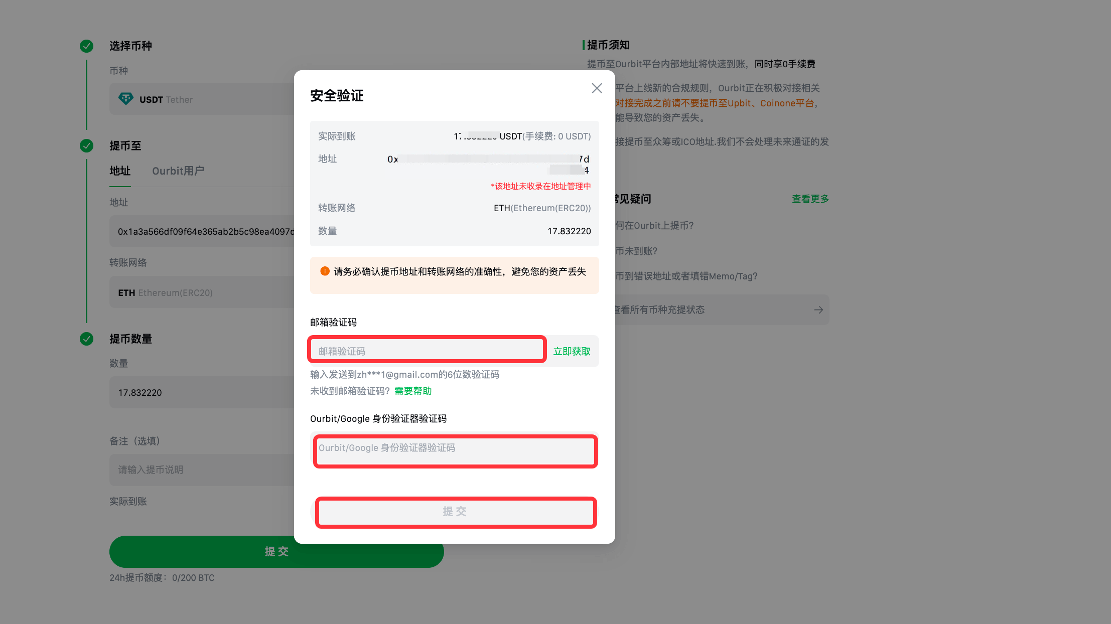 确认提币信息无误后,点击发送邮件验证码并填写,填写谷歌验证码,点击【提交】。