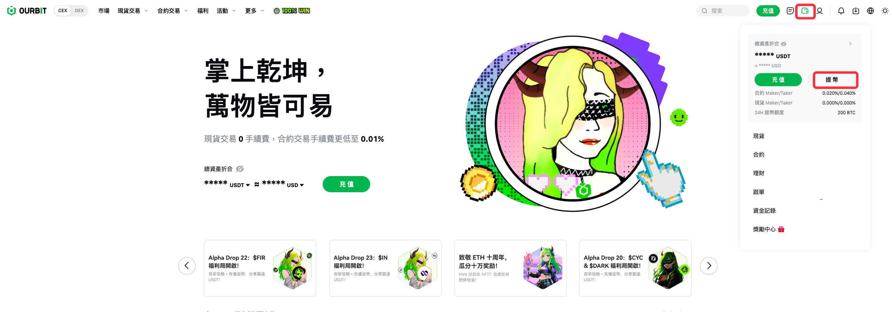 第一步:点击Ourbit官网首⻚右上⻆【资产图标】,选择【提币】。