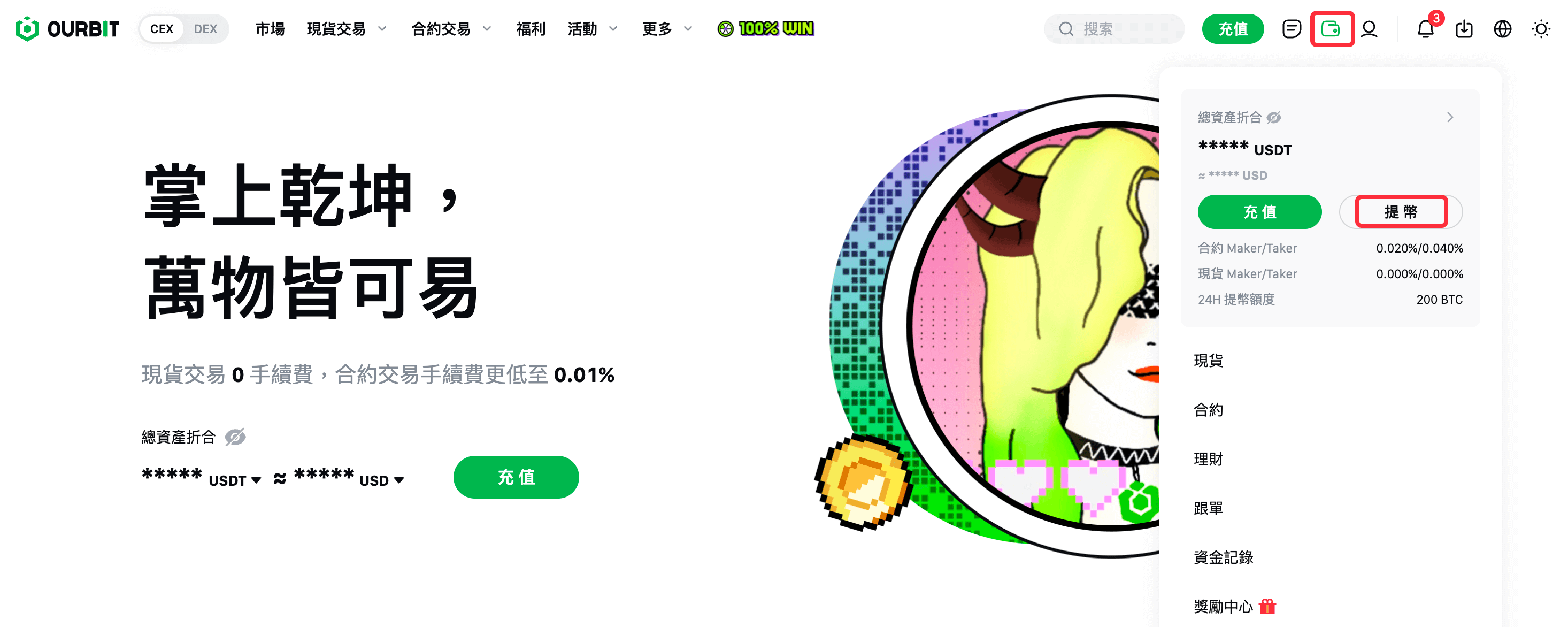 第一步:點擊Ourbit官網首⻚右上⻆【資產圖標】,選擇【提幣】。