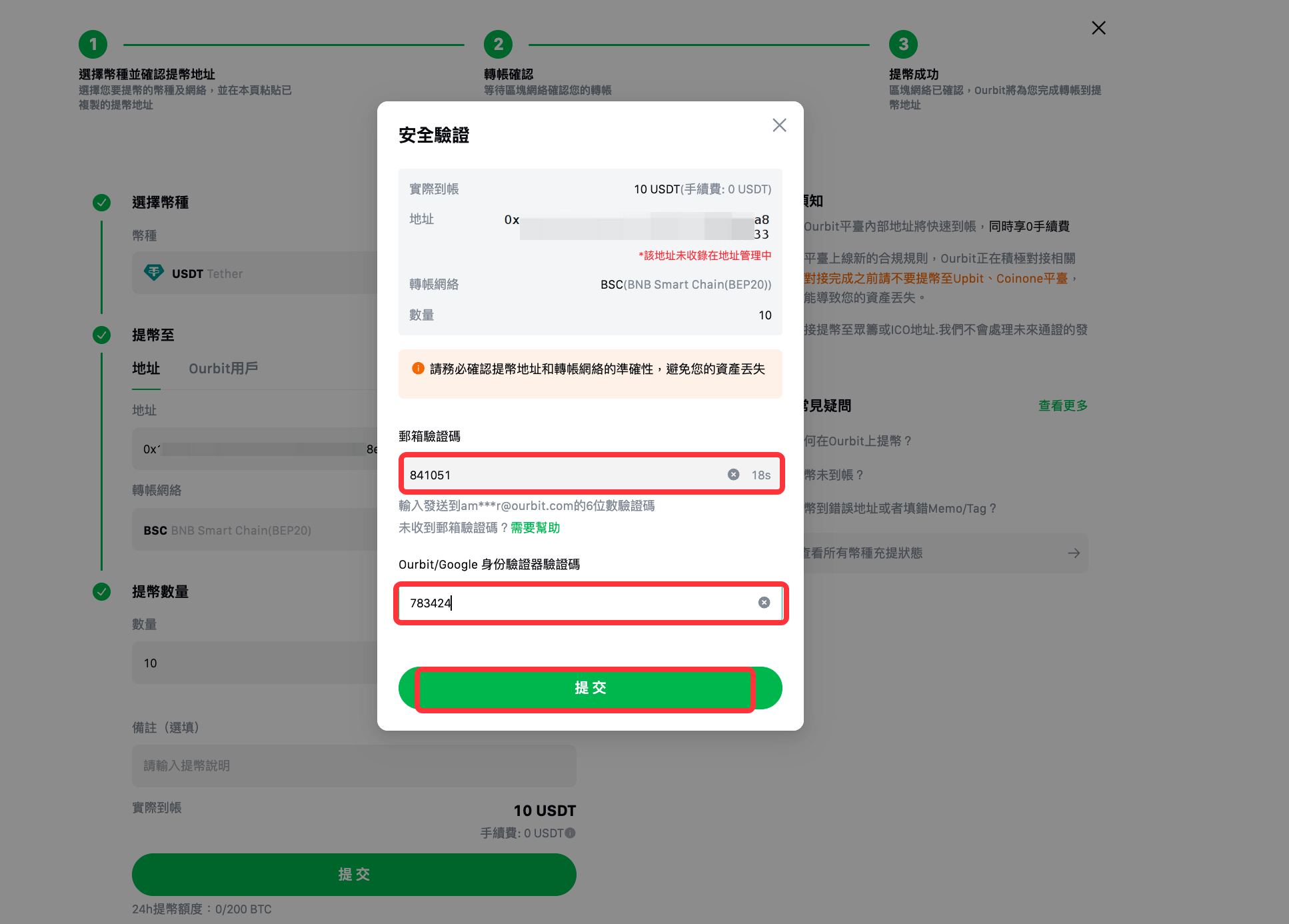 第三步:確認提幣信息無誤後,點擊發送郵件驗證碼並填寫,填寫谷歌驗證碼,點擊【提交】。