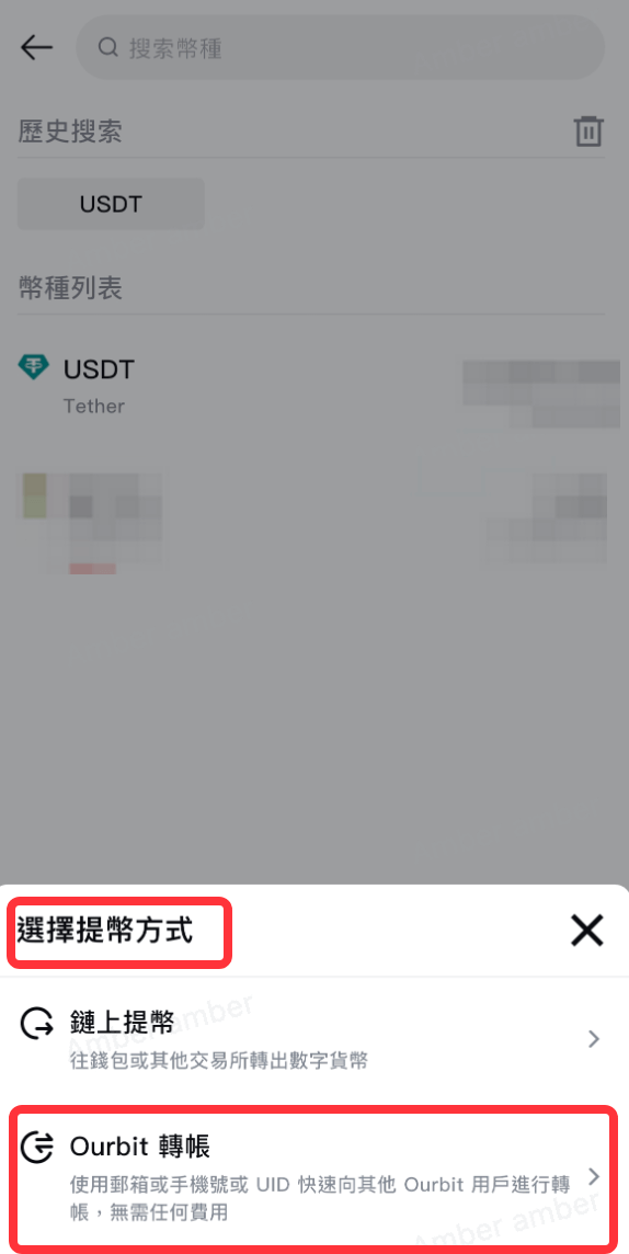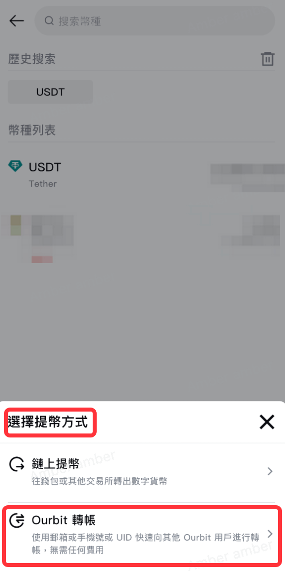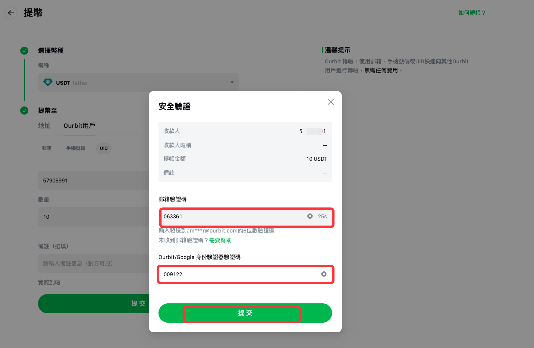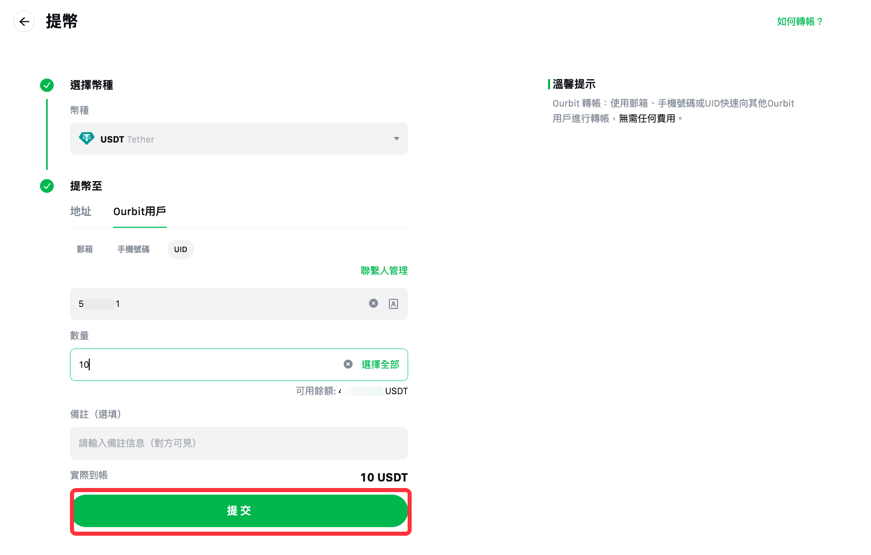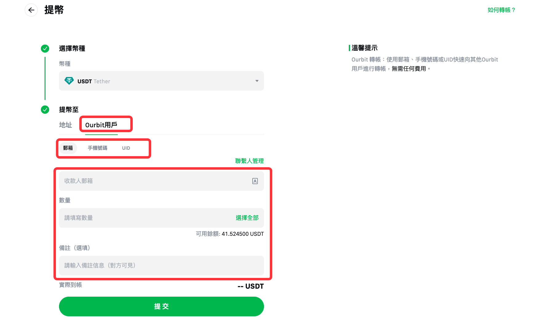 3.提幣方式選擇【Ourbit轉賬】,目前支持【郵箱】、【手機號碼】、【Ourbit UID】三種轉賬方式,填寫接收轉賬的賬戶信息。