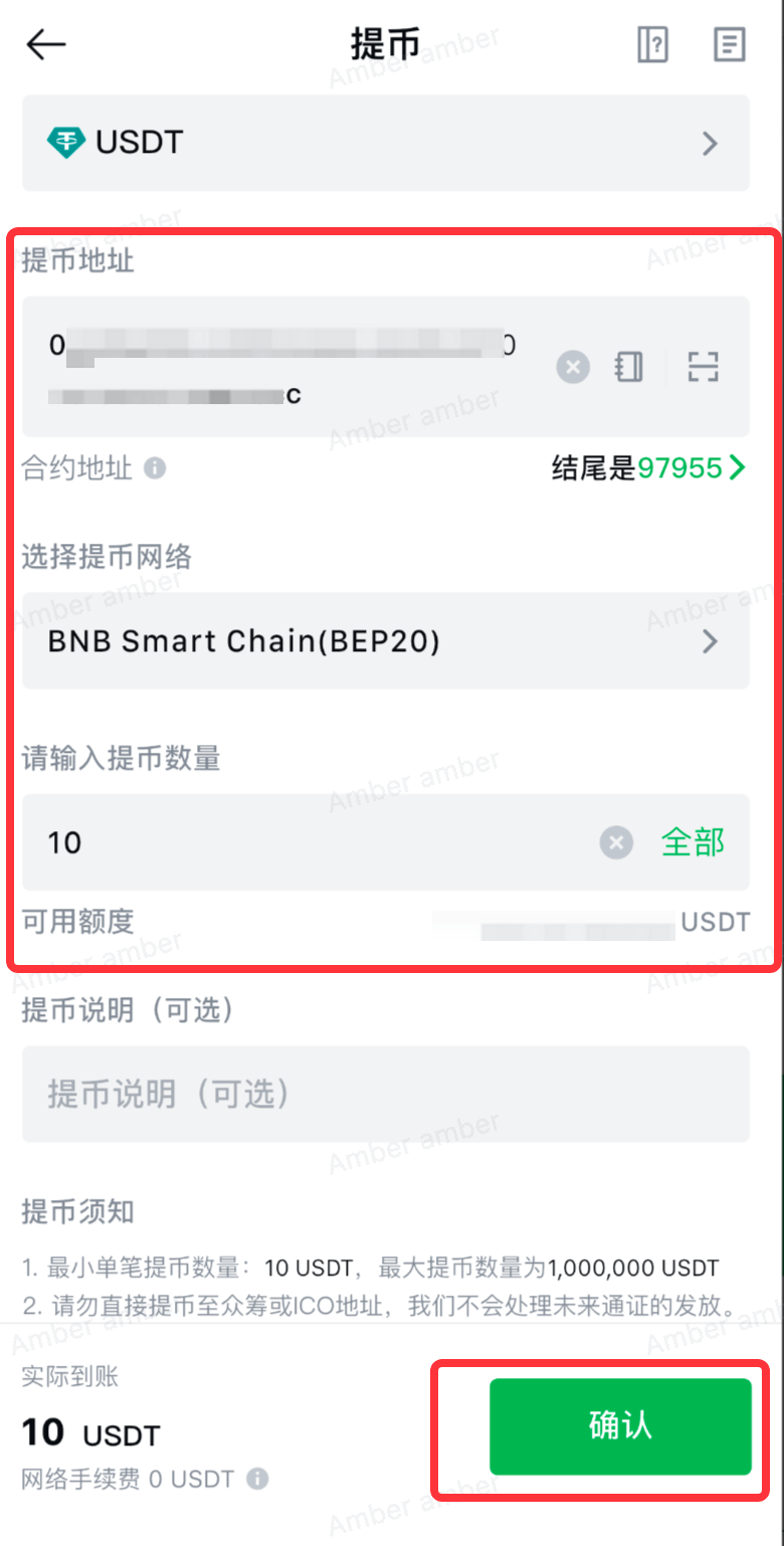 4.填寫【提幣地址】、【選擇提幣網絡】和填寫【提幣數量】,點擊【確認】。